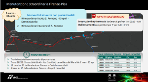 Altra importante interazione arriverà da analoghi lavori di rinnovo binari che interesseranno nello stesso periodo – 2 marzo/30 aprile – la linea Pisa-La Spezia. Anche in questo caso ci saranno variazioni di orario, fino a 10 minuti, che potranno cumularsi con quelle previste sulla linea pisana per chi utilizza treni che percorrono entrambe le tratte.