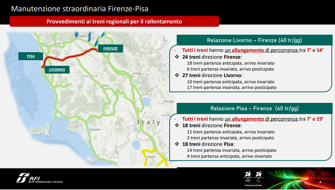 Durante tutto il periodo dell’intervento, nel rispetto della normativa nazionale sulla sicurezza, i treni in transito nelle aree di cantiere dovranno tenere velocità limitata e questo comporterà cambiamenti rispetto alla consueta programmazione. Le variazioni di orario sono state stimate da RFI e Trenitalia tra i 7 ed i 20 minuti, con ripercussioni maggiori sulle tratte più lunghe.