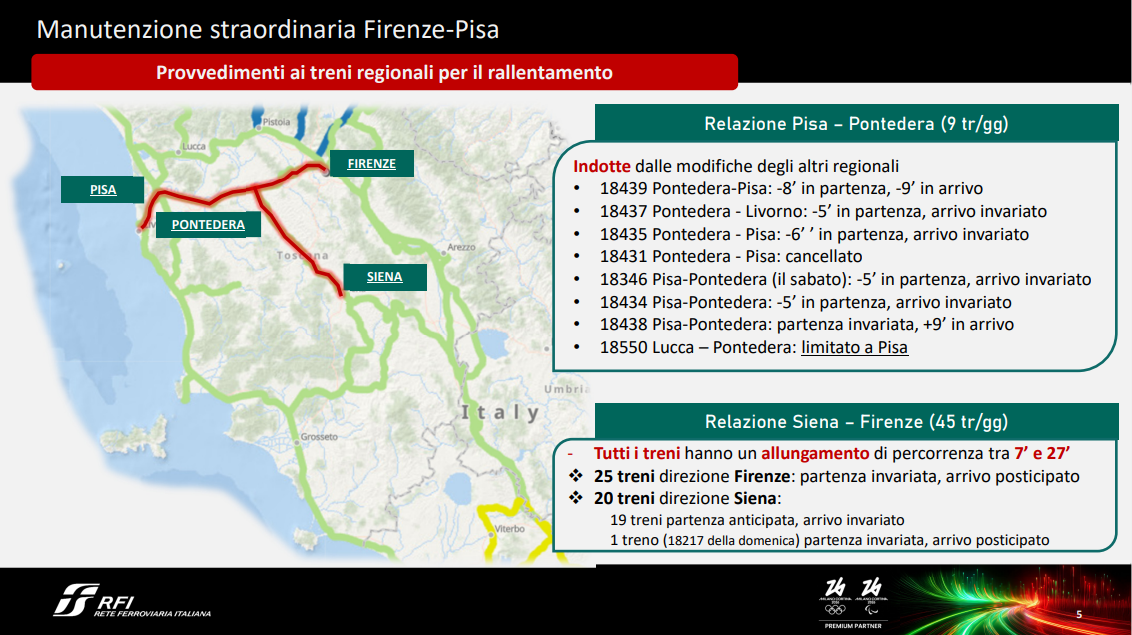 Le variazioni di orario lungo la linea pisana andranno ad interessare anche le linee Firenze-Grosseto e Firenze-Siena, che con la pisana condividono parzialmente il tracciato.