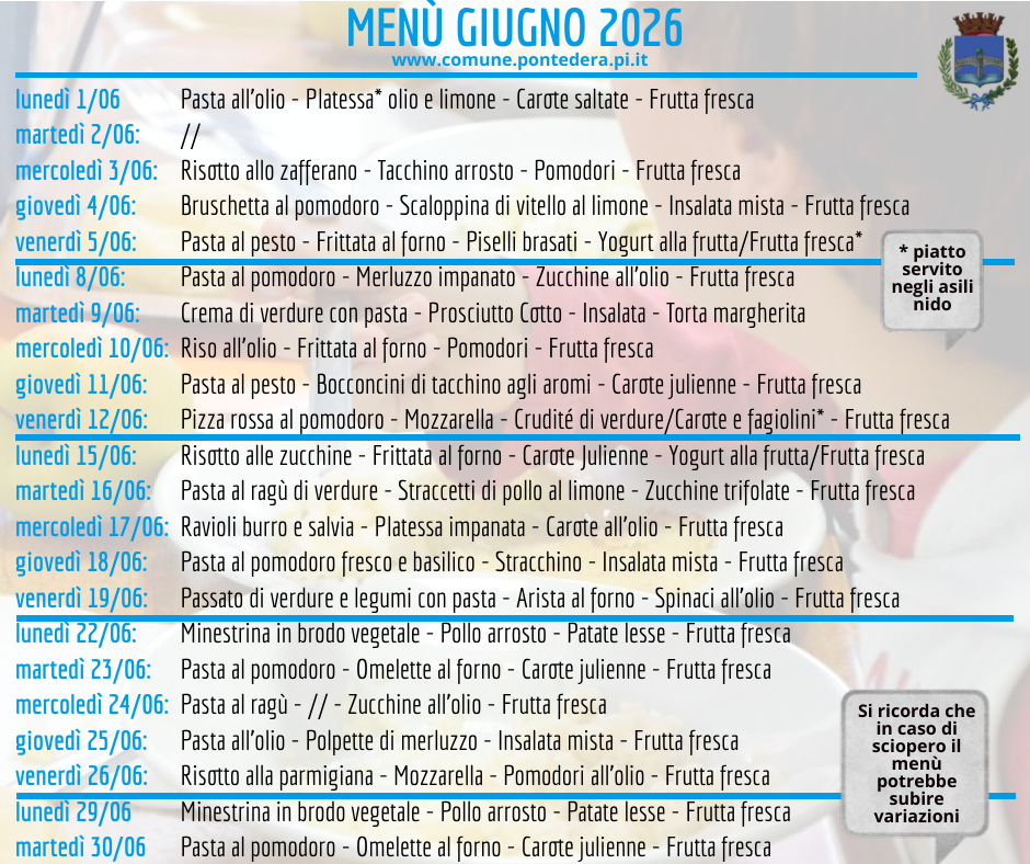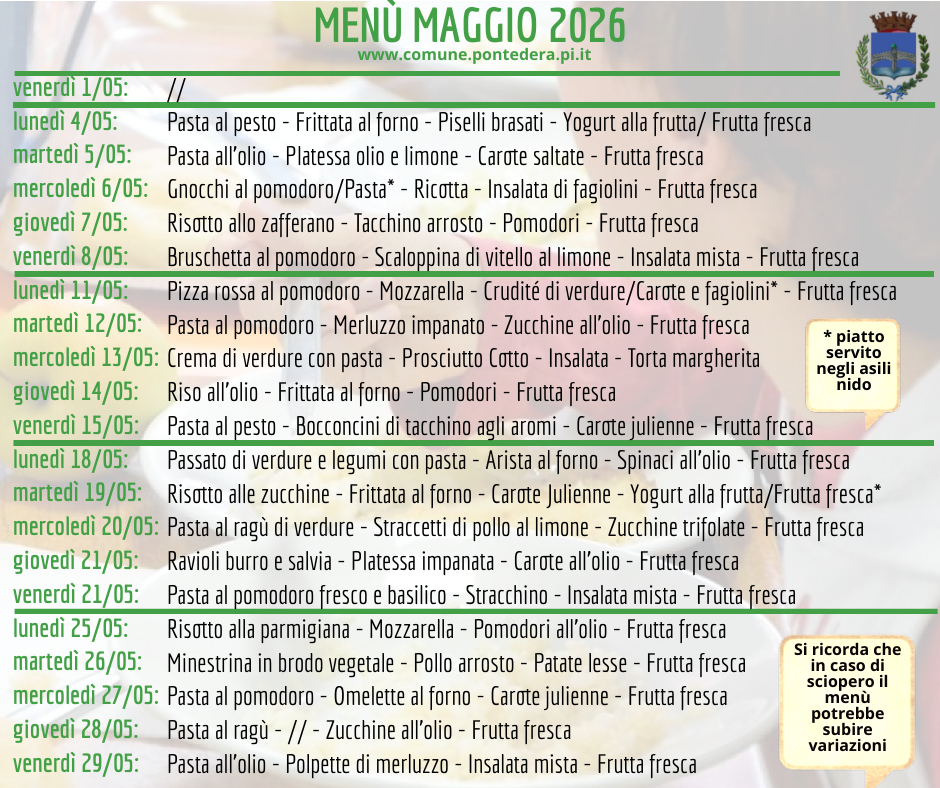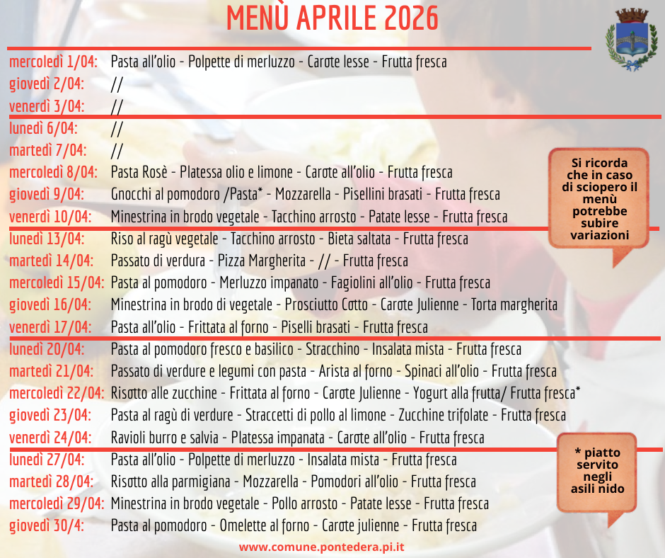 Ecco i menu delle mense scolastiche pontederesi per i mesi di aprile, maggio e giugno 2026. Sono stati elaborati sulla base delle indicazioni della Commissione Mensa e hanno ottenuto la validazione da parte del competente Dipartimento dell’Azienda Usl. Ricordiamo che dal 20 aprile prende il via menu primaverile/estivo