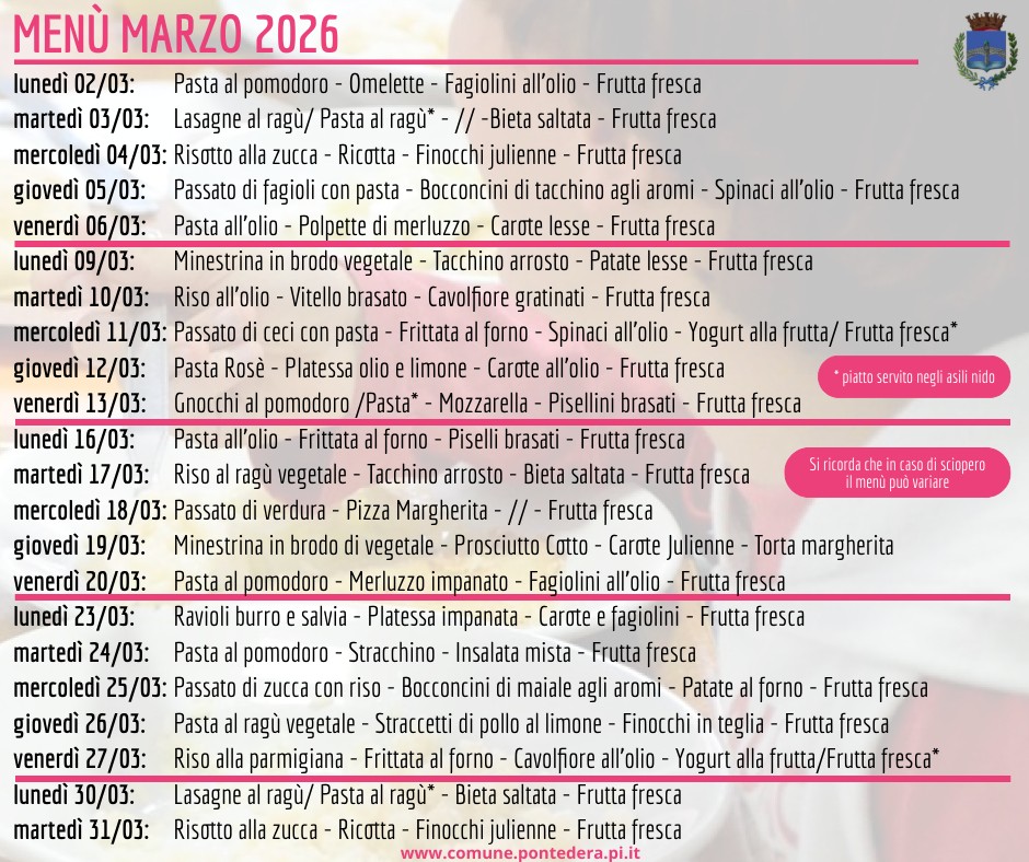Ecco i menu delle mense scolastiche pontederesi per il mese di marzo