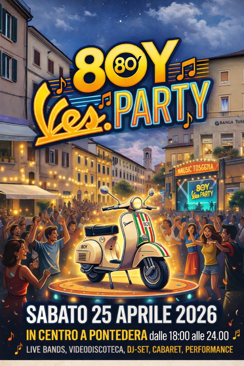 La sera di sabato, 25 aprile, dalle ore 18 alle 24, spazio alla musica nel centro cittadino. In programma ci sono due momenti di spettacolo su altrettanti palchi, in piazza Cavour e in piazza Curtatone. Il Ves. Party 80Y proporrà livebands, videodiscoteca, dj set, cabaret, performance, in quella che sarà una vera e propria festa per celebrare gli ottanta anni di un mito.