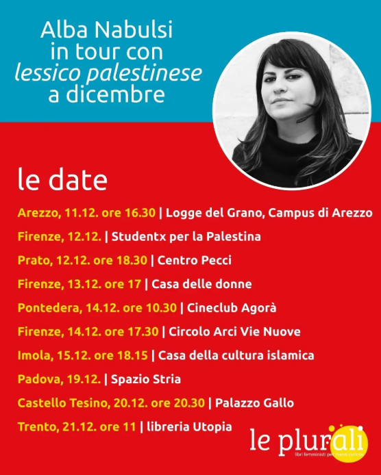 Domenica 14 dicembre, alle ore 10,30, la giornalista, educatrice e ricercatrice Alba Nabulsi sarà a Pontedera. Lo farà per una tappa del suo tour di presentazione di "Lessico palestinese" al cineclub Agorà. Ingresso libero e gratuito.