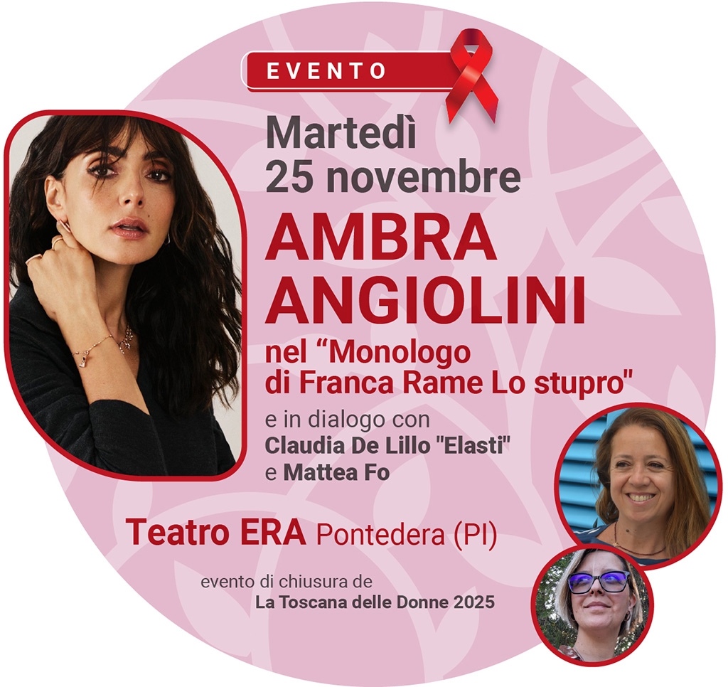 Ambra Angiolini porta sul palco il “Monologo di Franca Rame: Lo Stupro” e dialoga con Claudia De Lillo, giornalista, scrittrice e conduttrice radiofonica, nota anche con lo pseudonimo di “Elasti“, e Mattea Fo, Presidente della Fondazione Fo Rame. Evento di chiusura de La Toscana delle Donne 2025.