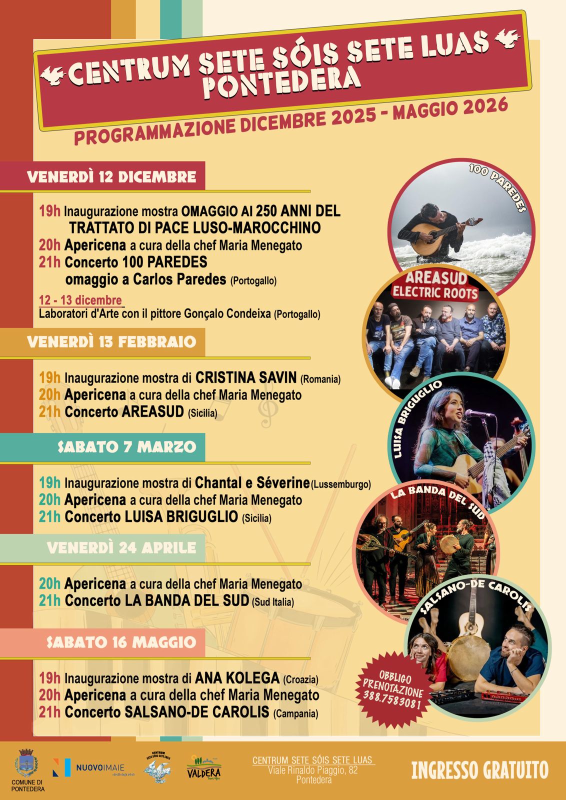Tutti gli eventi sono a ingresso gratuito e si svolgeranno al Centrum Sete Sóis Sete Luas, in Viale Rinaldo Piaggio 82, Pontedera.