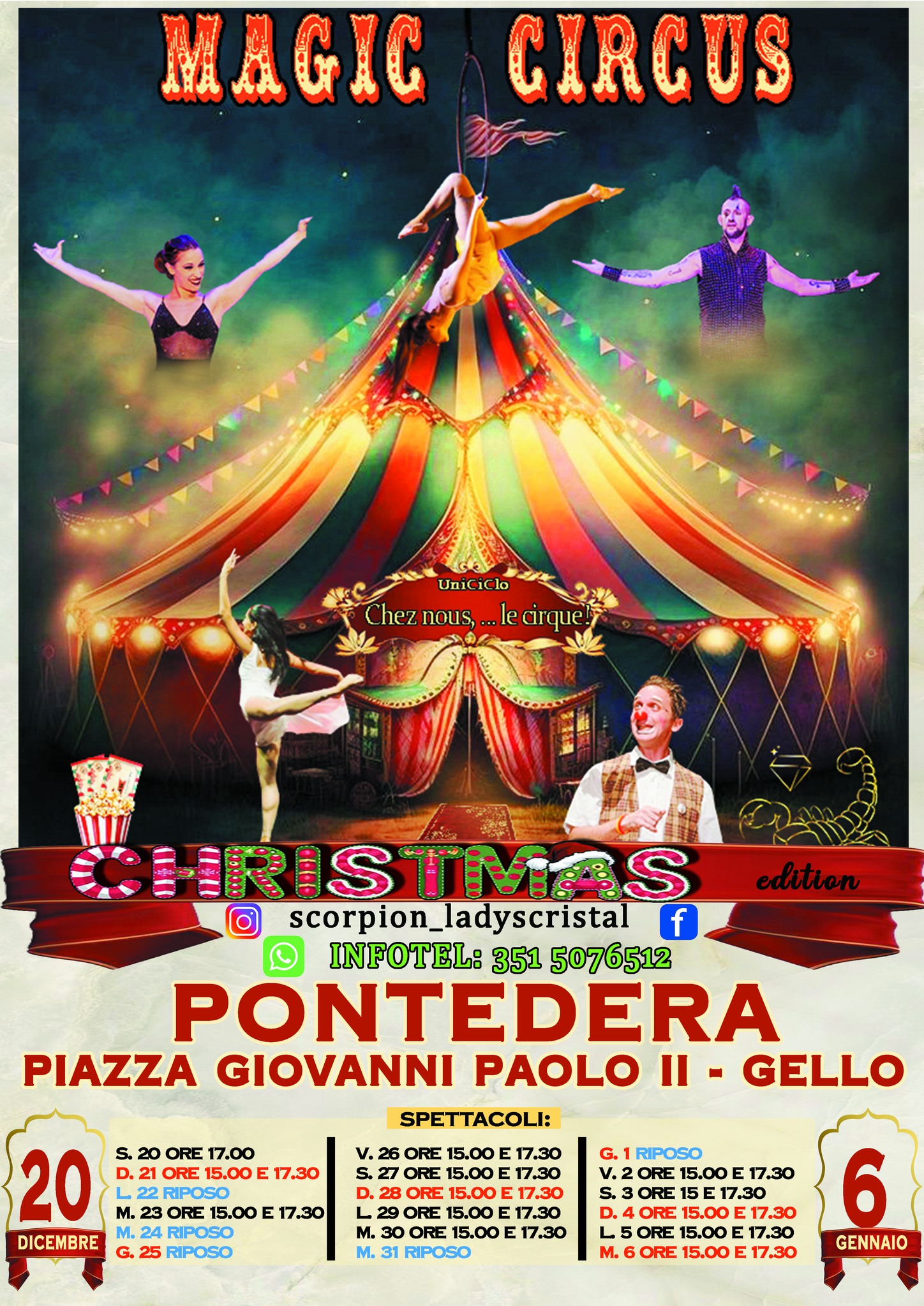 Piazza Giovanni Paolo II (nella frazione di Gello) presso il tendone di Chez Nous le Cirque accoglie, dal 20 dicembre al 6 gennaio, ๐๐๐จ๐ซ๐ฉ๐ข๐จ๐ง & ๐๐๐๐ฒ ๐๐ซ๐ข๐ฌ๐ญ๐๐ฅ in ๐๐๐ ๐ข๐ ๐๐ข๐ซ๐๐ฎ๐ฌ ๐๐ก๐จ๐ฐ ๐๐ก๐ซ๐ข๐ฌ๐ญ๐ฆ๐๐ฌ