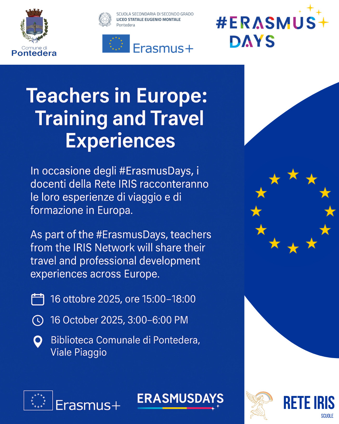 Proprio in occasione degli Erasmus Days, i docenti della Rete Iris ( che promuove l'internazionalizzazione ) si ritroveranno all'auditorium della Biblioteca Gronchi per un momento di confronto e scalbio, raccontando esperienze di viaggio e formazione in Europa.