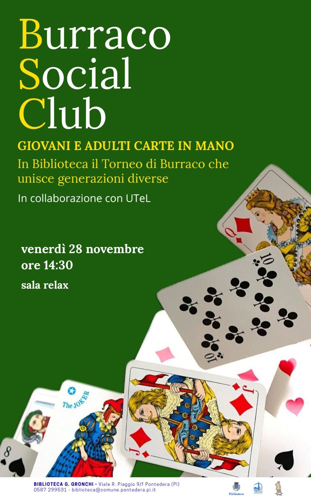 L'area relax della biblioteca comunale Giovanni Gronchi ospiterà il Burraco Social Club, una iniziativa che vedrà giovani e adulti con le carte in mano a giocare a burraco. L'iniziativa è a cura dell'Università del Tempo Libero
