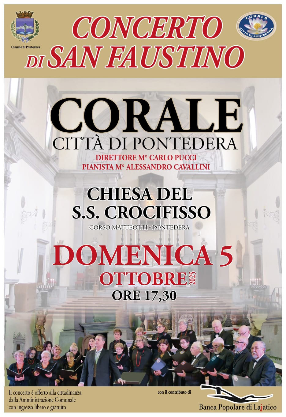 In occasione dei festeggiamenti per il patrono cittadino, la Corale Città di Pontedera va ins cena con il tradizionale Concerto di San Faustino. L'appuntamento è per domenica 5 ottobre, alle ore 17,30, nella chiesa del Santissimo Crocifisso su Corso Matteotti. Ingresso libero