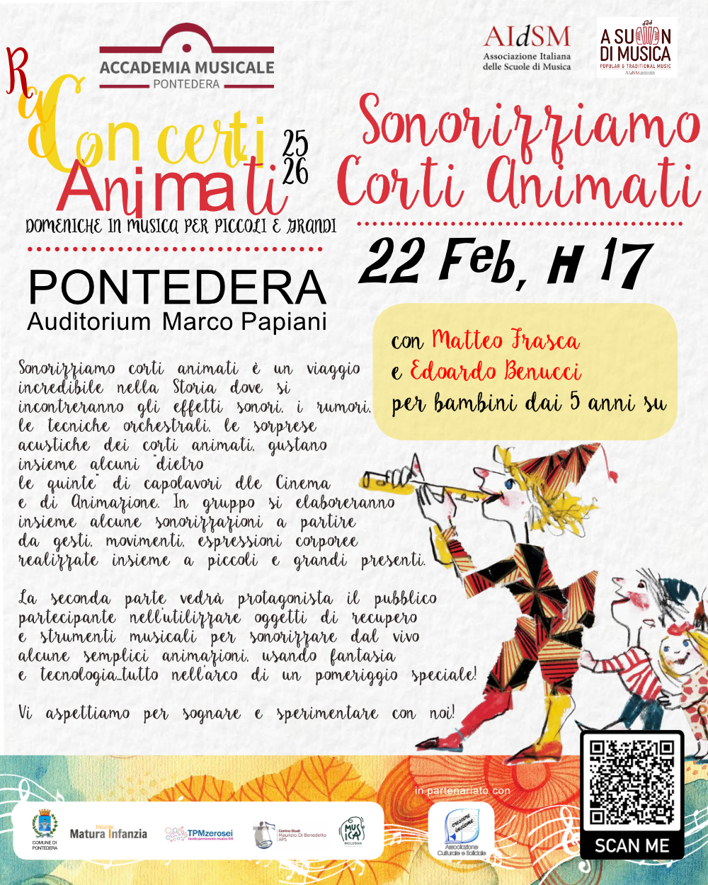 Sonorizziamo corti animati è un viaggio incredibile nella Storia dove si incontreranno gli effetti sonori, i rumori, le tecniche orchestrali, le sorprese acustiche dei corti animati, gustano insieme alcuni "dietro le quinte" di capolavori del Cinema e di Animazione.