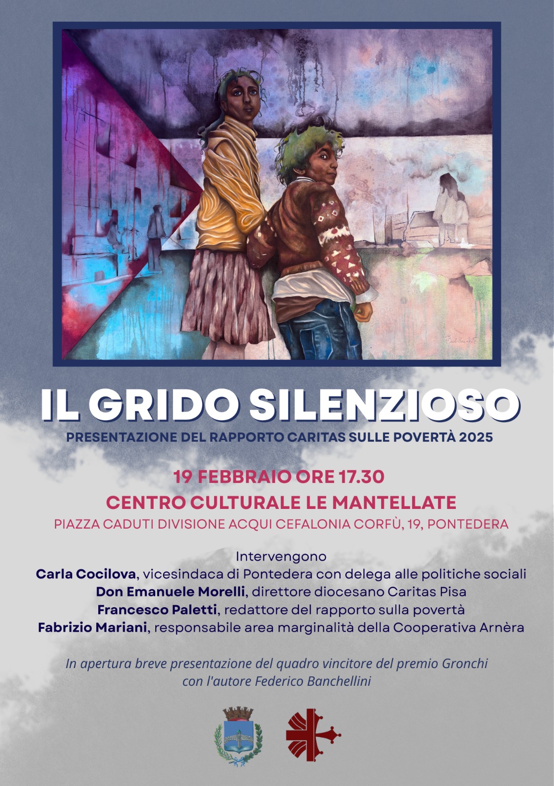 All'incontro, dal titolo "Il grido silenzioso", prenderanno parte la vicesindaca di Pontedera con delega alle politiche sociali Carla Cocilova, Don Emanuele Morelli, direttore diocesano Caritas Pisa, Francesco Paletti, redattore del rapporto sulle povertà e Fabrizio Mariani, responsabile area marginalità della cooperativa Arnera. In apertura ci sarà una breve presentazione del quadro vincitore del premio Gronchi, con l'autore Federico Banchellini.