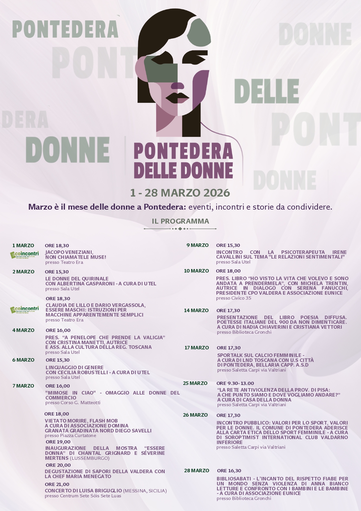 Tre iniziative in programma per Pontedera delle Donne nella giornata di sabato 7 marzo. Si parte con "Mimose in Ciao" alle ore 16, omaggio alle donne del commercio in Corso Matteotti. Alle ore 18 flash mob in piazza Curtatone dal titolo "Vietato morire" a cura di associazione Domina Granata - gradinata nord Diego Savelli. Alle ore 19 inaugurazione della mostra "Essere donna" di Chantal Grignard e Severine Mertens negli spazi del Centrum Sete Sois Sete Luas, a cui seguirà la degustazione di sapori della Valdera con la chef Maria Menegato e il concerto di Luisa Briguglio