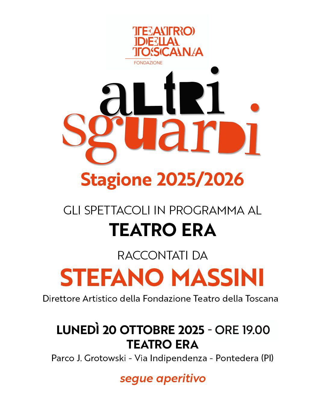 Le scelte di questa stagione teatrale a Pontedera – che va sotto il titolo di ‘Altri sguardi’, titolo che tiene insieme la programmazione di tre teatri: Era, Pergola e Nuovo Rifredi Scena Aperta – verranno raccontate dal direttore artistico del Teatro della Toscana, Stefano Massini, in un incontro con il pubblico, aperto a tutti, lunedì 20 ottobre, alle ore 19, al Teatro Era.