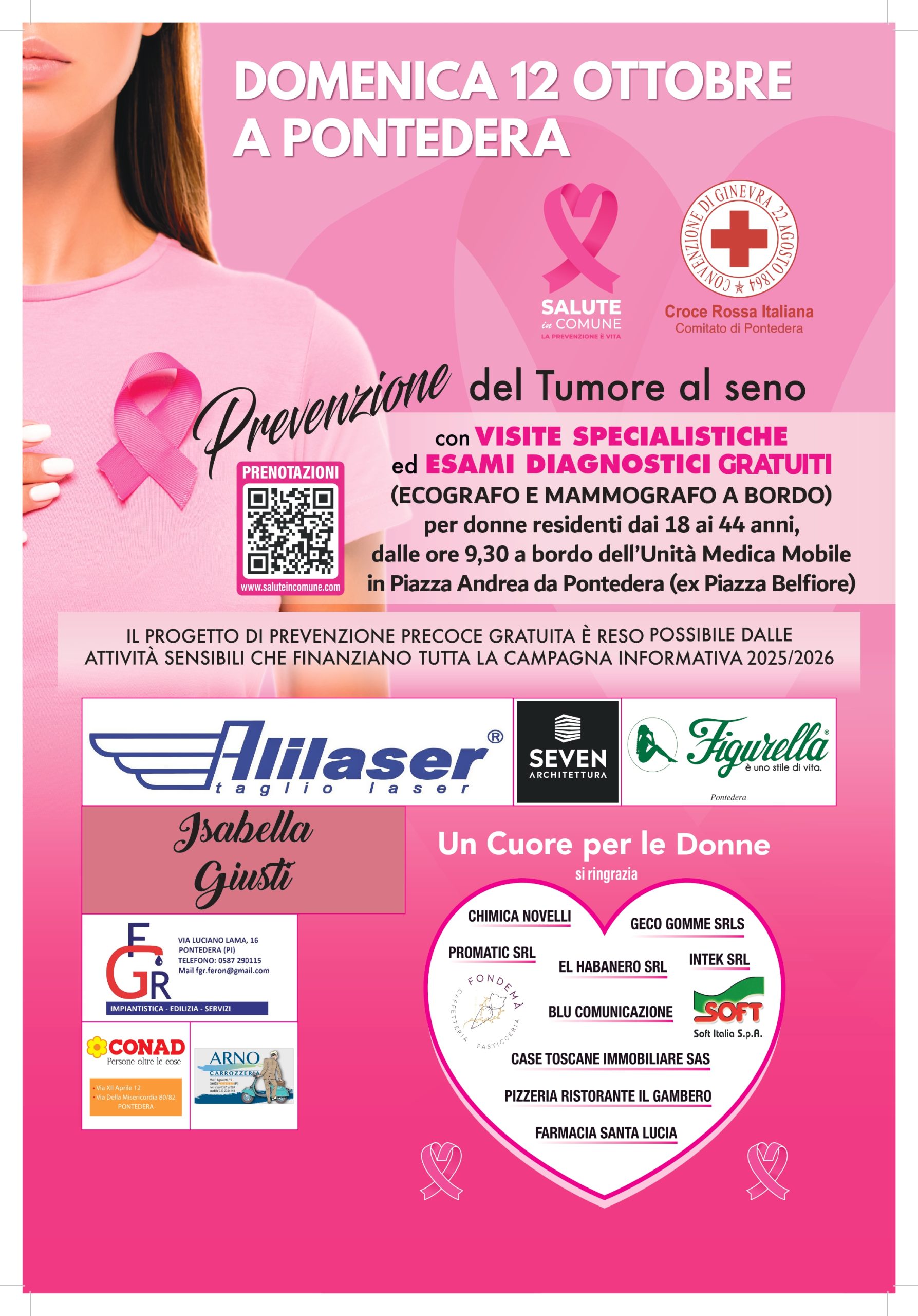 Domenica 12 ottobre, in piazza Andrea da Pontedera ( ex piazza Belfiore ), la Croce Rossa Italiana, comitato di Pontedera, organizza una giornata di prevenzione del tumore al seno.