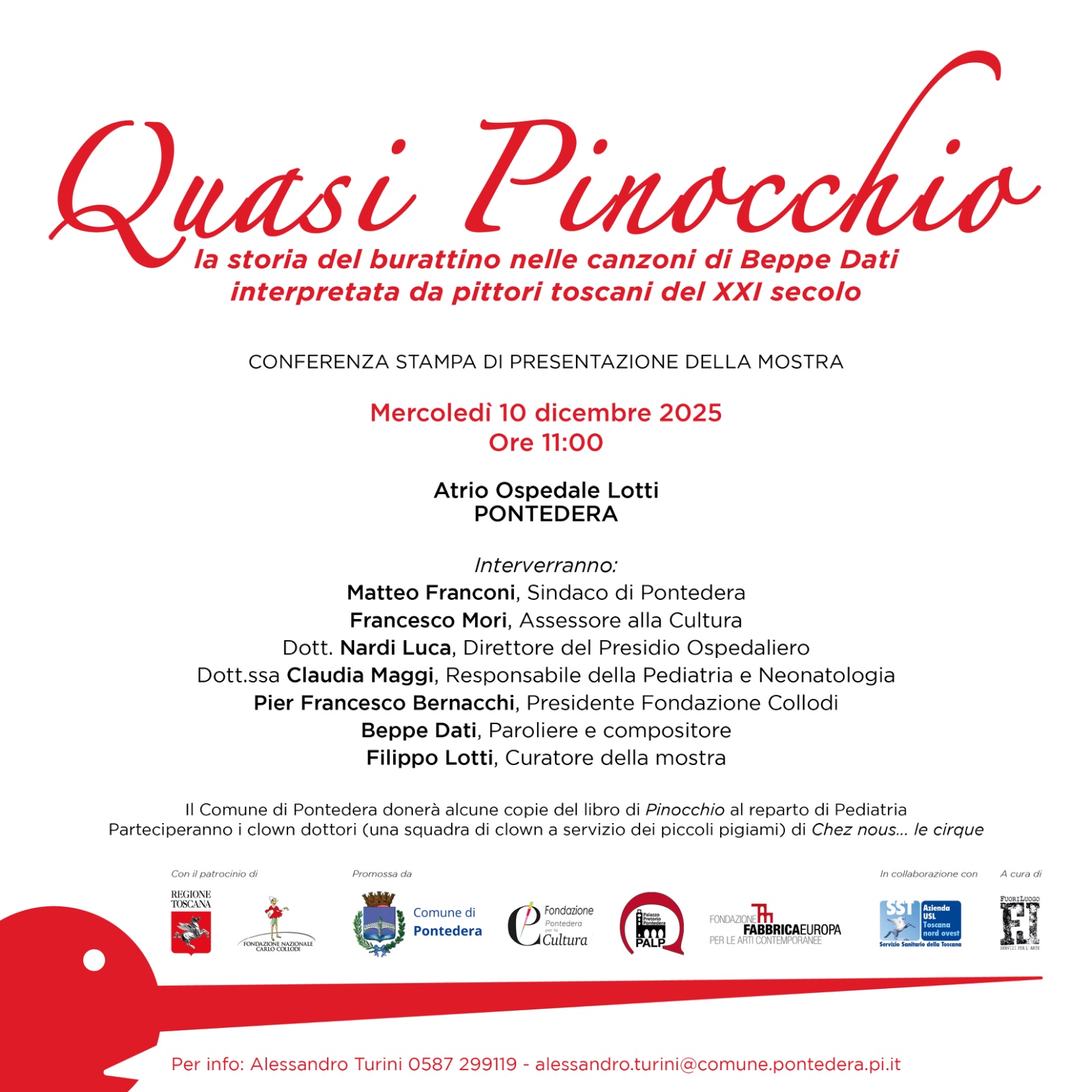 "Quasi Pinocchio" è la mostra che rientra nel cartellone di "Natale in Opera - Equilibrio in Gioco" e che si inaugura mercoledì 10 ottobre nell'atrio dell'ospedale Lotti di Pontedera.