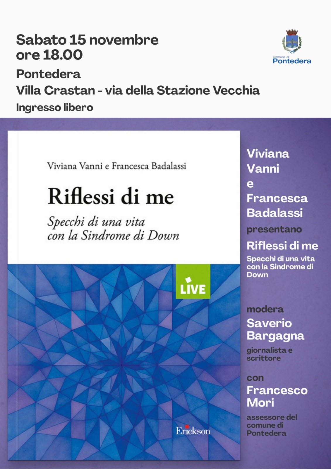 Si intitola "Riflessi di me" ed è il libro di Viviana Vanni e Francesca Badalassi dedicato agli "Specchi di una vita con la sindrome di down". L'evento è ad ingresso libero e gratuito e prevede l'intervento dell'assessore alla cultura del Comune di Pontedera Francesco Mori.