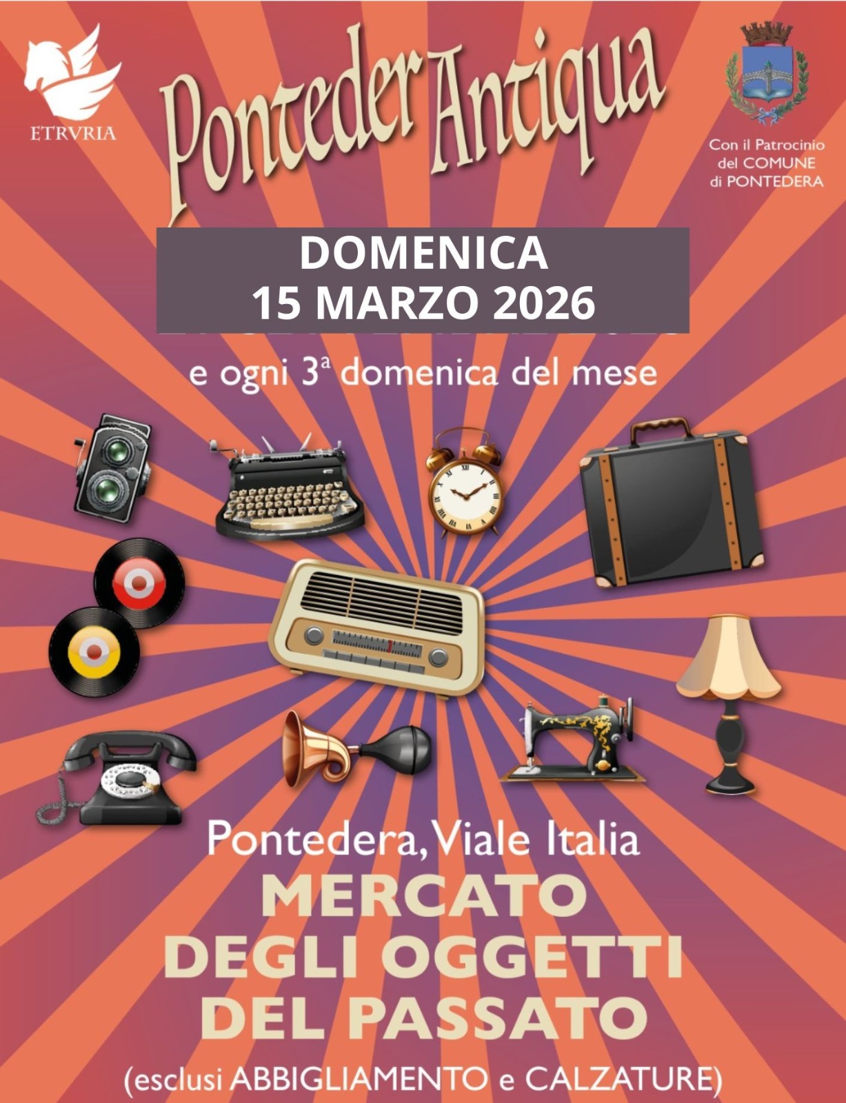 Terza domenica del mese e appuntamento canonico per Pontedera Antiqua, mercato di oggetti del passato. La location sarà quella di Viale Italia con orario continuato 9 - 19. Una novantina gli espositori attesi da tutta la Toscana per un appuntamento che ha cadenza mensile, ogni terza domenica del mese.