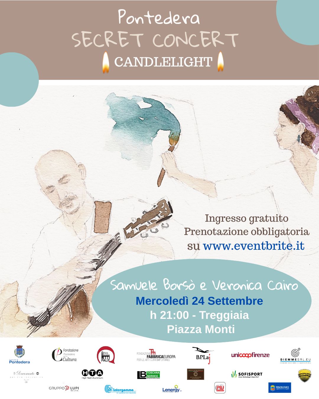 Ultimo appuntamento del ciclo di Secret Concert di Samuele Borsò accompagnato da Veronica Cairo. L'appuntamento è per la sera del 24 settembre alle ore 21 nel centro storico di Treggiaia.