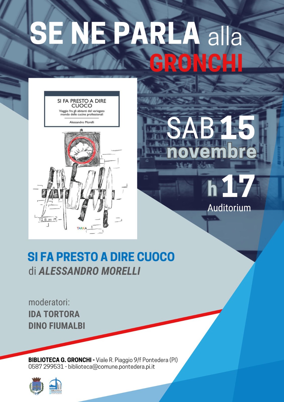 All'auditorium della biblioteca Gronchi presentazione dei libro "Si fa presto a dire cuoco" di Alessandro Morelli, vincitore nel 2022 nella sezione Cucina del Premio Bancarella.