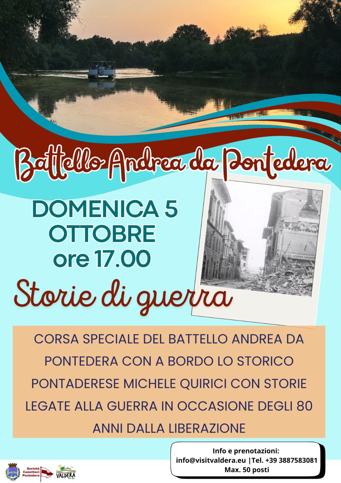 Una corsa speciale del battello fluviale "Andrea da Pontedera", con l'accompagnamento di Michele Quirici, che traccerà un quadro storico degli eventi che hanno caratterizzato il periodo bellico a 80 anni dalla Liberazione.
