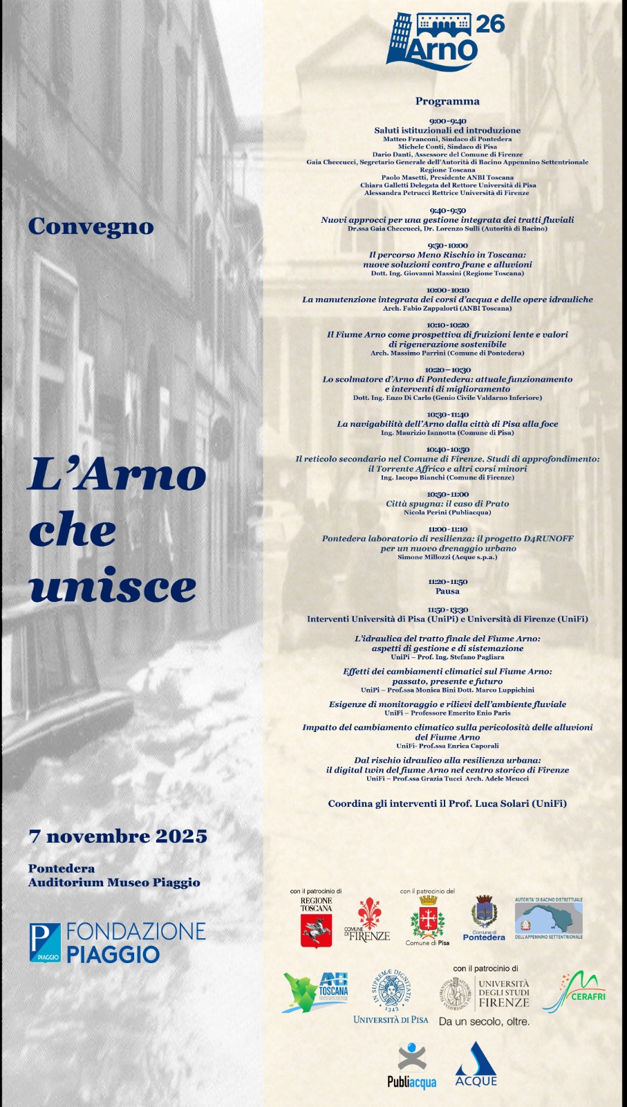 Si intitola "L'Arno che unisce" ed è un importante convegno che si svolge nella mattinata del 7 novembre al Museo Piaggio, mettendo a confronto vari esperti che interverranno su vari temi che riguardano il principale fiume toscano.
